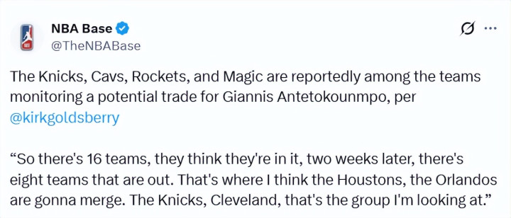 北京时分3月30日,NBA专栏作者戈兹贝里在播客节目中炫耀,尼克斯仍是成心通过交游引进字母哥的球队之一。尽管他们本赛季已是东部定约顶级强队之一,但仍未退出对于字母哥的交游照应。