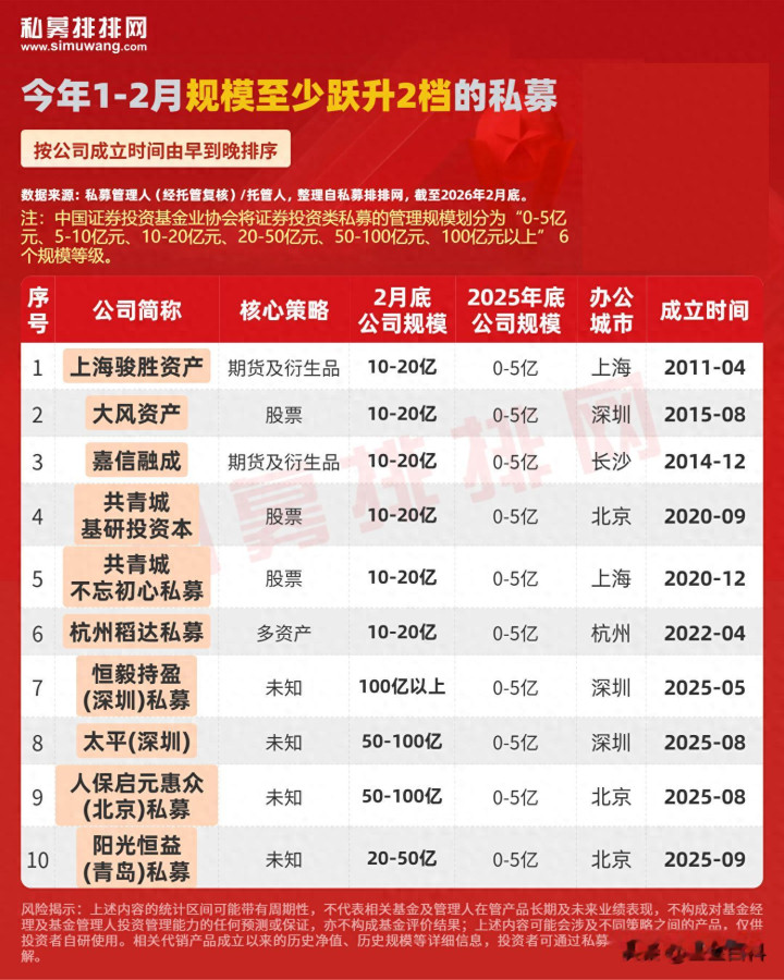 东说念主保启元惠众(北京)私募是一家建造于2025年8月的规模跃升私募公司,中枢政策暂未表露,办公地位于北京。公司措置规模从2025年底的0-5亿元跃升至2026年2月底的50-100亿元,完了了措置规模的普及。