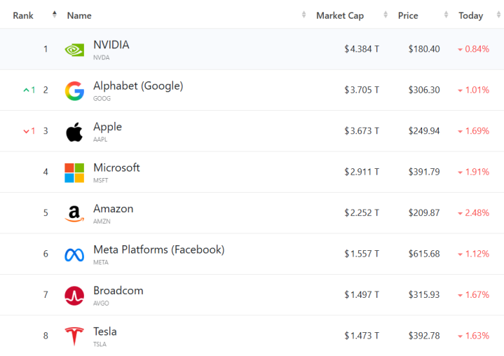 大型科技股集体着落,(按市值罗列)英伟达跌0.84%,谷歌C跌1.01%,苹果跌1.69%,微软跌1.91%,亚马逊跌2.48%,Meta跌1.12%,博通跌1.67%,特斯拉跌1.63%。