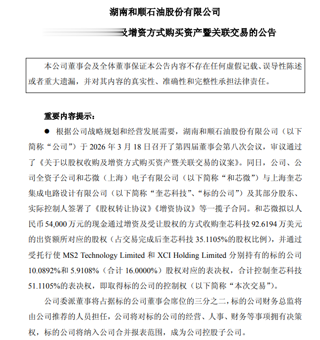3月18日,和顺石油(603353.SH)公告称,公司全资子公司和芯微拟以5.4亿元现款通过增资及受让股权神色收购上海奎芯集成电路贪图有限公司35.11%股权,滚球app中国官方网站并通过受托附近MS2TechnologyLimited和XCIHoldingLimited捏有的16%表决权,所有戒指奎芯科技51.11%表决权,得到其戒指权,看法公司将纳入公司清除报表限度。