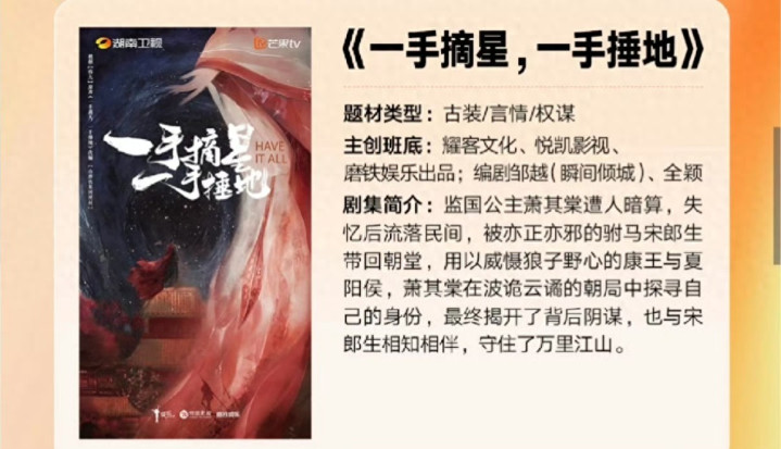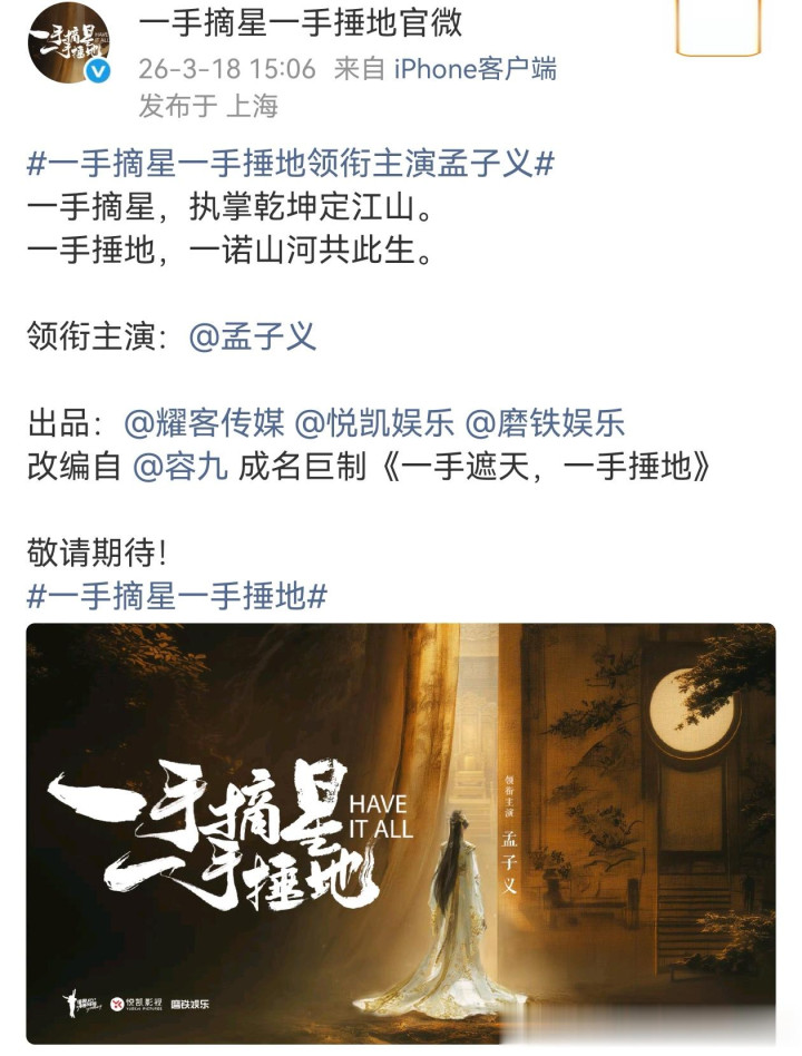 《一手摘星一手捶地》是由耀客传媒、悦凯文娱、磨铁文娱勾搭出品,编剧是邹越(《星汉灿烂》)和全颖(《良辰好景知几何》)。