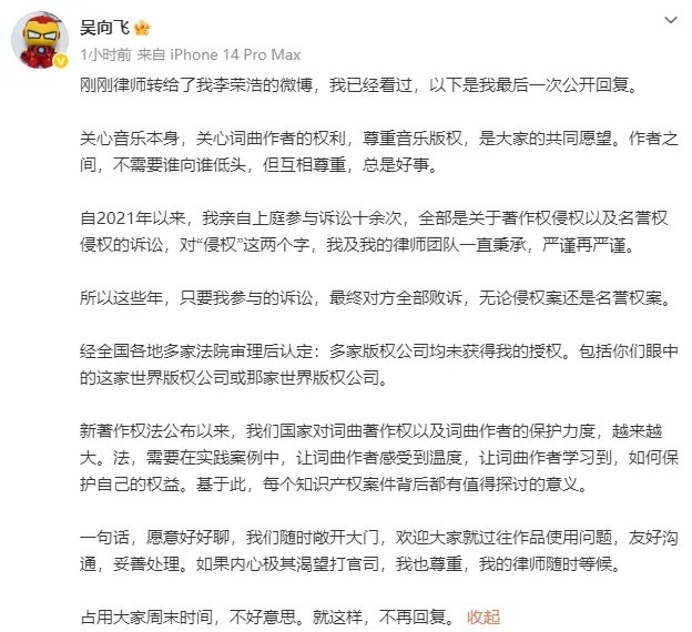 29日,吴向飞发文示意这是我方临了一次公开回复李荣浩:“一句话,景色好好聊,咱们随时掀开大门,接待群众就过往作品使用问题,友好交流,妥善解决。淌若内心极其渴慕打讼事,我也尊重,我的讼师随时等候。”
