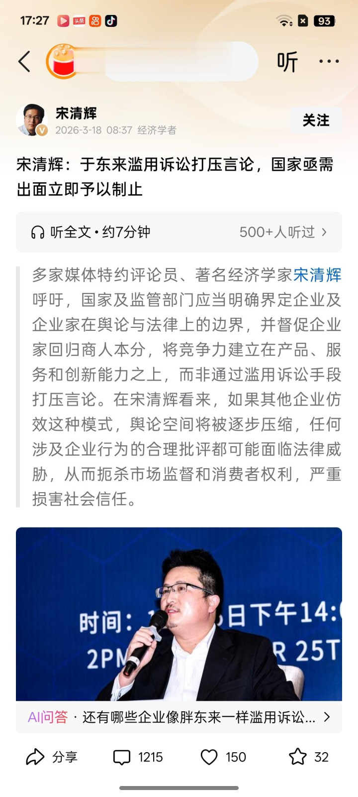 一样是3月18日的发文,标题为“于东来应用诉讼打压言论,国度亟需出头立即赐与制止”的著作,宋清辉针织更是站上谈德制高点关于东来进行谈德审判!