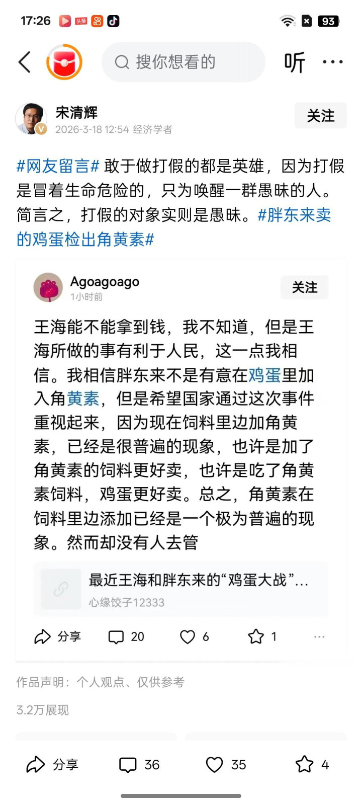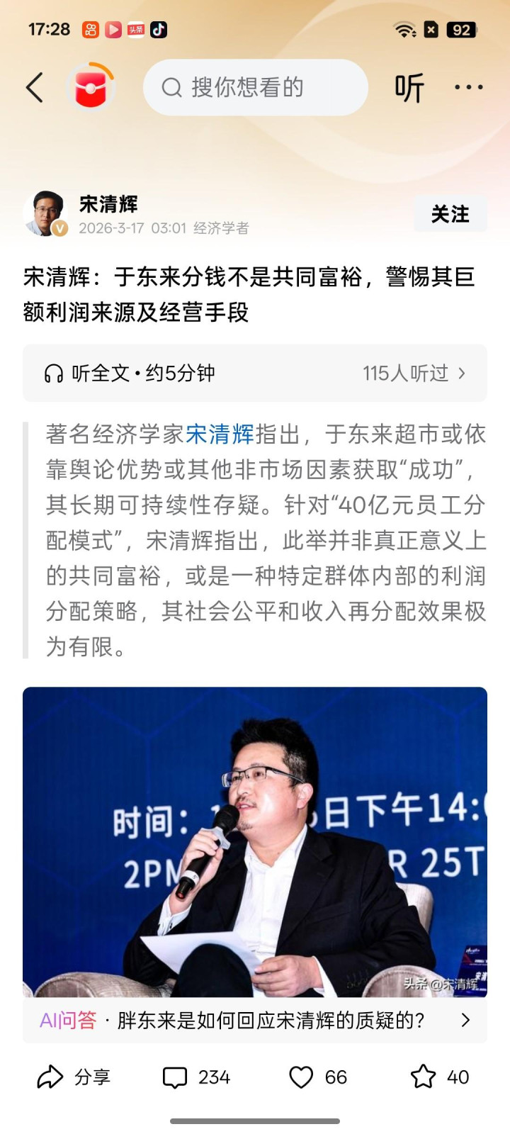 3月17号宋清辉发表著作“于东来分钱不是共同豪阔,警惕其多量利润起原及主见妙技”。