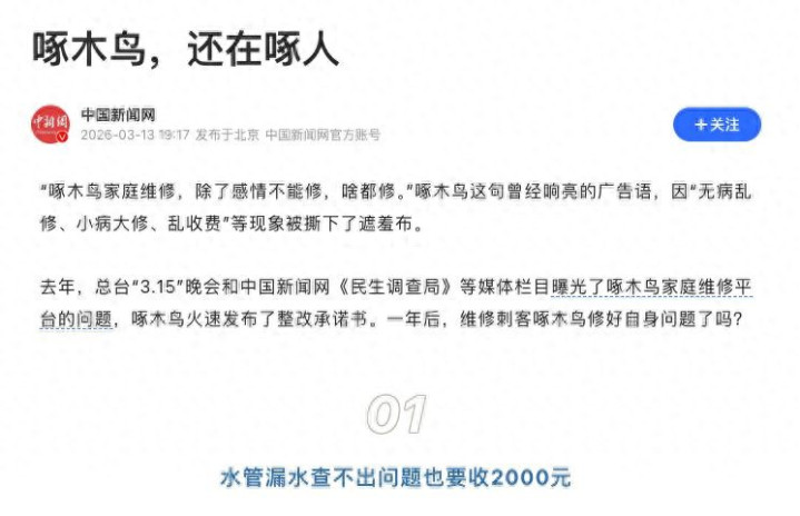 据中国新闻网报说念,被破钞者称为“维修刺客”的啄木鸟维修平台,因价钱不透明、乱收费、“微恙大修”等问题在2025年“3.15”晚会被曝光后,对外声称整改应承,但在一年后,种种用户体验问题依然存在。