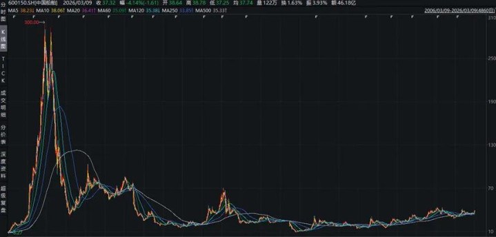 归天2026年3月17日,中国船舶收盘价为34.4元。接头词,将K线图上前复权20年,那座在2007年牛市巅峰创下的近300元(前复权)股价岑岭,于今仍像一座驴年马月的墓碑,耸峙在行业周期的循环之中。