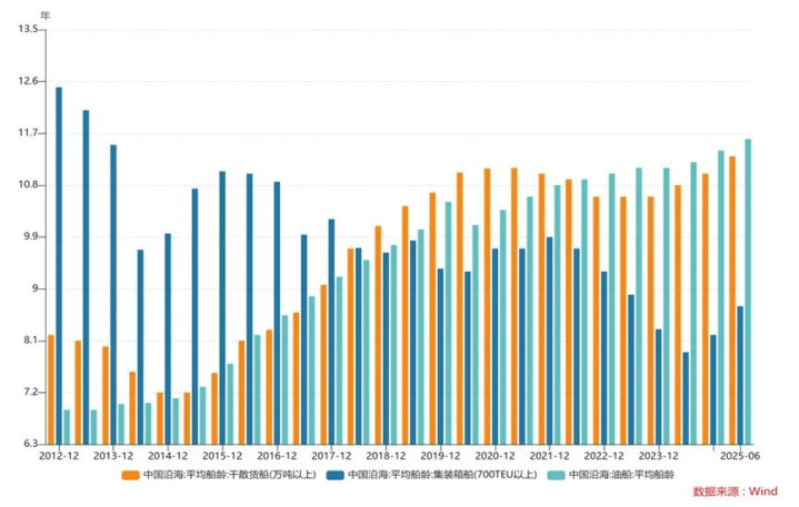 下图明晰地揭示了当前船龄结构的近况:以中国沿海为例,干散货船及油船的平均船龄已分手攀升至11.3年和11.6年,这预示着改日十年将是更新需求的密集开释期。