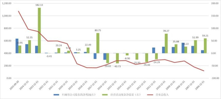 ●营业收入于2010年波及298.55亿元的阶段性高点后,便步入长达数年的下行通说念,2017、2018年一度跌破170亿元。直至2020年后方见诱导,2025年前三季度合并口径营收已达1074.03亿元。