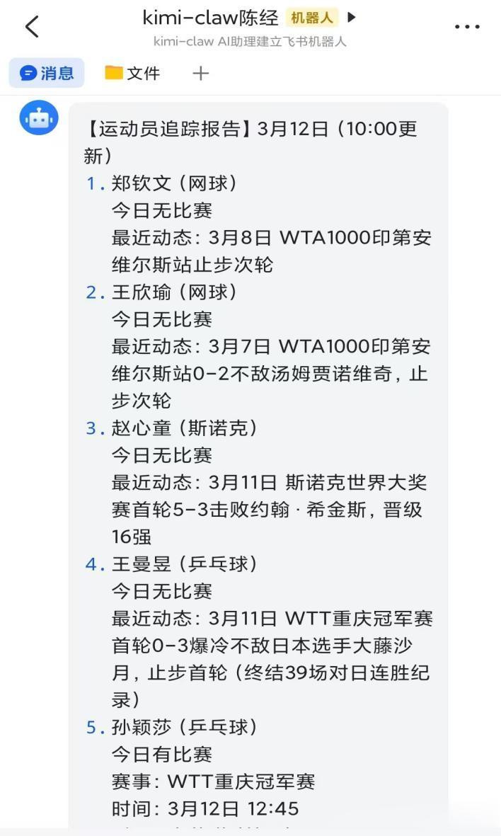 可以用“通晓员比赛追踪”的案例,来具体证据OpenClaw运行一个任务的过程。我在飞书上(或者KimiClaw网页上聊天也可以),条目“更新下六个通晓员的追踪信息”。这六个通晓员是郑钦文、王欣瑜、赵心童、王曼昱、孙颖莎、王楚钦,是之前交待的,放在Memory文献里了。