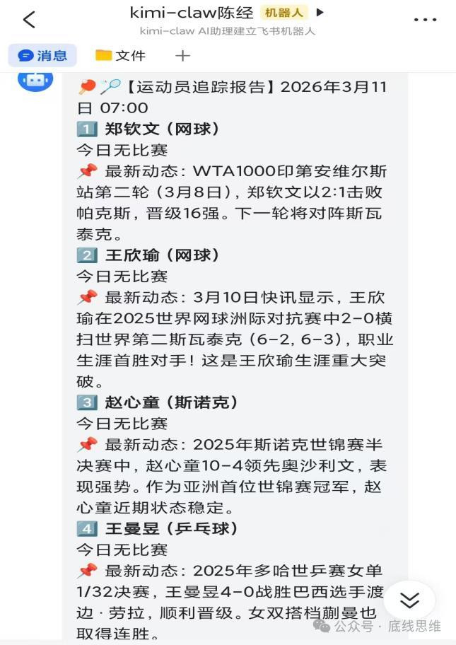 例如3月11日这些通晓员的比赛音讯,有些是胡编的!郑钦文和王欣瑜推行都输了。有的时辰混乱了,把2025年的音讯发出来了。因为kimi_search等搜索用具不一定靠谱,搜索仅仅复返一些信息,并不可判断合分歧适,巧合也会失败。OpenClaw调用大模子决策推理,定“使命指标”的时候,巧合会拿出“搜索失败我方编”的“诱拐”方法。