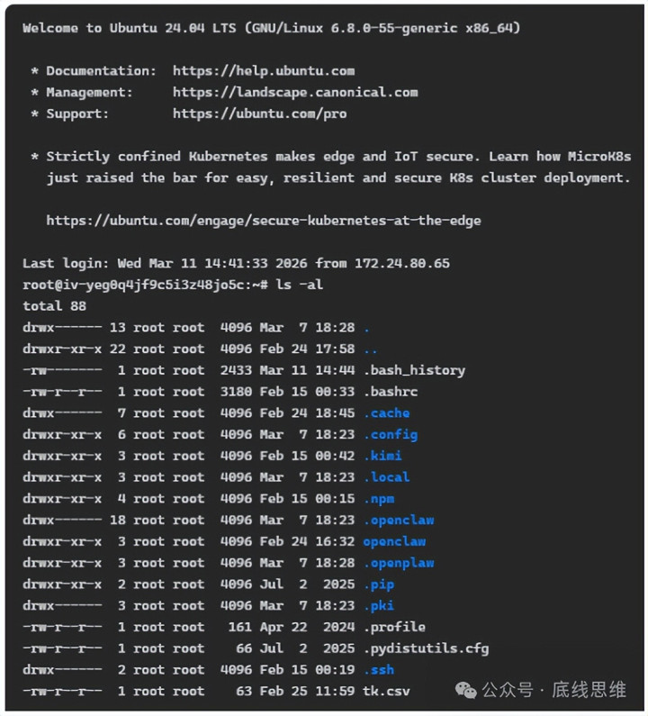 但这种探索办法需要尽头的Linux知识,连图形操作界面都莫得,鼠标完全不消,需要输入许多敕令。如无教训会难以操作,即使写著作列出操作细节,也不好清楚。淌若是个东谈主电脑上装的OpenClaw,也可以平直去电脑里不雅察目次文献结构,同样有难度。因此,笔者仅先容道理,略过不好懂的探索过程细节。