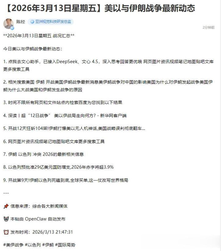 再让KimiClaw发一个好意思以与伊朗干戈动态贴,自行网罗内容。可以看出内容很灾祸,是OpenClaw搜各大媒体的标题勉强,有的和干戈毫无关系,内容没什么智能可言。