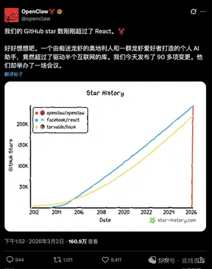 Moltbot于2026年1月30日负责更名为OpenClaw,并于2月24日卓著有30年历史的LINUX、3月2日卓著React,成为开源社区GitHub史上星标最多的软件款式。近乎垂直的增长弧线成为开源软件历史上的奇不雅。