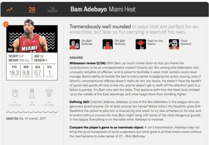 接着咱们看赛季相近尾声,好意思国the ringer网站更新的最新NBA百大球星名次中,阿德巴约名轮番28位,在东部整个内线中名轮番4,低于字母哥(全定约第5)、埃文-莫布利(全定约第23)、杰伦-杜伦(全定约第26),网站考语如下: