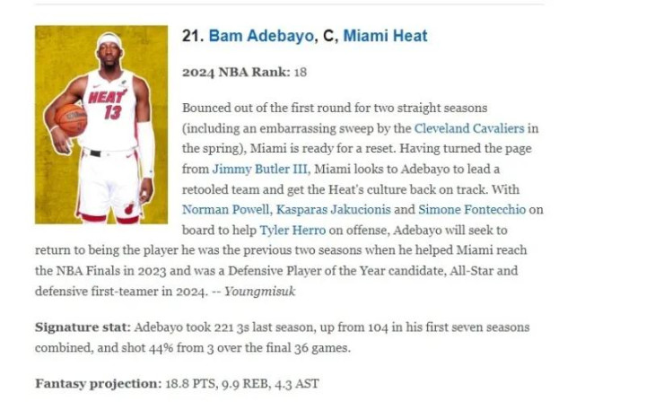 在赛季初好意思国ESPN评比的NBA百大球星中,阿德巴约名轮番21,网站考语如下:
