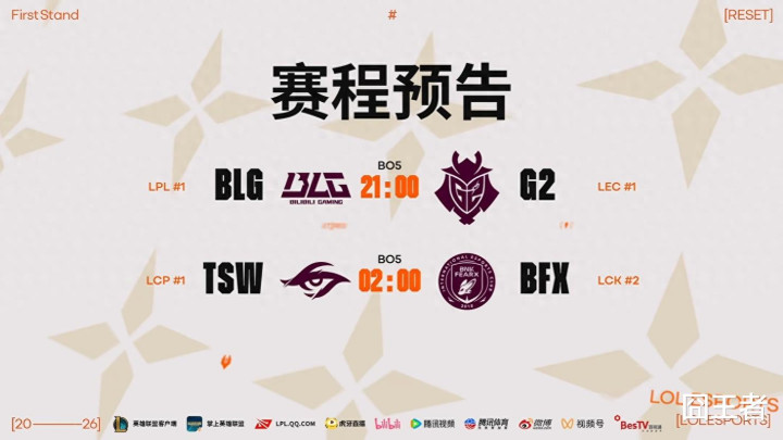 今天的赛程安排是,由BLG对阵G2,BFX对阵TSW。在最初司法的第一场比赛中,BLG零封G2;那么TSW和BFX,他们谁胜谁负呢,就交给赛场上来一决凹凸吧。
