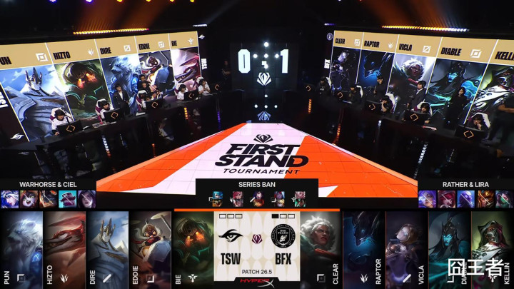 第一局比赛,BFX蓝色方,禁用:发条、瑞兹、泰坦、狗熊、纳尔,采选:Clear鳄鱼、Raptor赵信、VicLa安妮、Diable EZ、Kellin扇子妈;TSW红色方,禁用:寒冰、露露、兰博、奎桑提、梅尔,采选:Pun格温、Hizto蔚、Dire狐狸、Eddie韦鲁斯、Bie洛