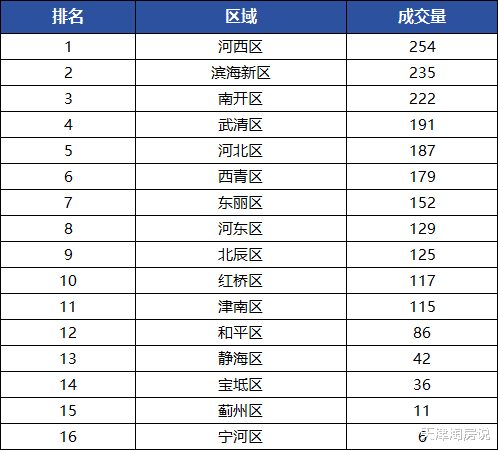 河西以254套登顶成交榜单第一位,南开周成交量也达200多套。