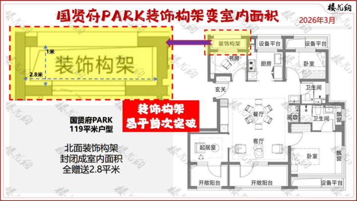 3、2026年2月份,昌平国贤府PARK亮相,它的户型北面,出现了一个新物种:阻滞构架,可阻滞成室内面积,全补救,北京创始。