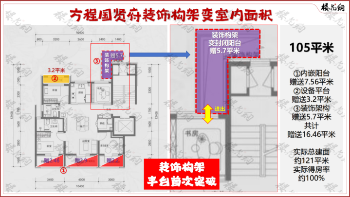 以105平米户型为例,阻滞架构面积约5.7平米,从书斋北面开门可收支。