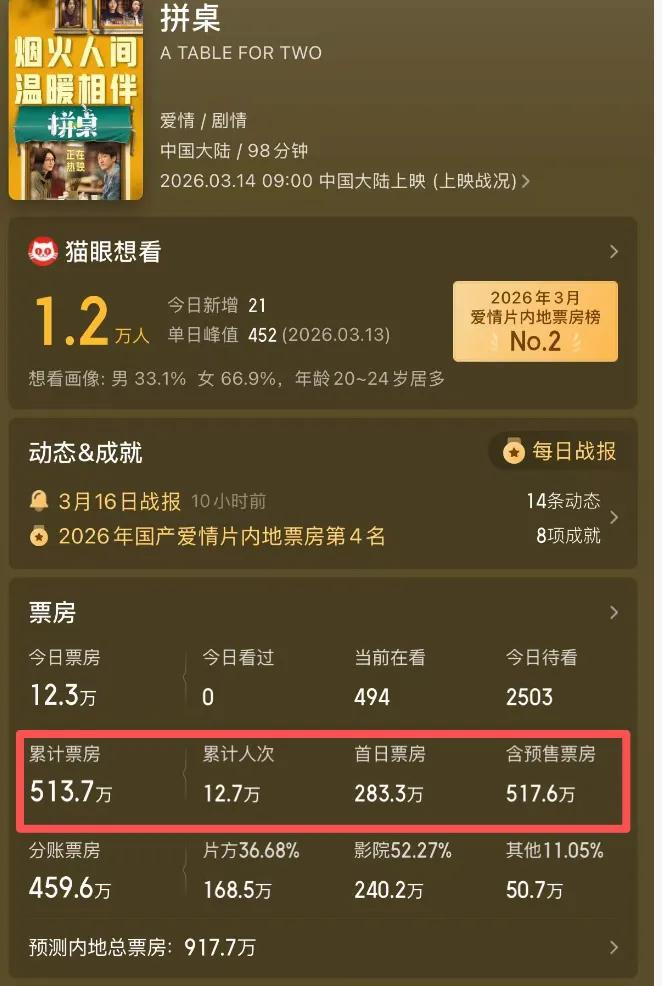再查票房的时候,老编还发现了一部新片,上映了实在莫得任何的温文,即是这一部《拼桌》,齐上映了好几天了,票房唯独513万,且聚首好几天齐在倒挂。