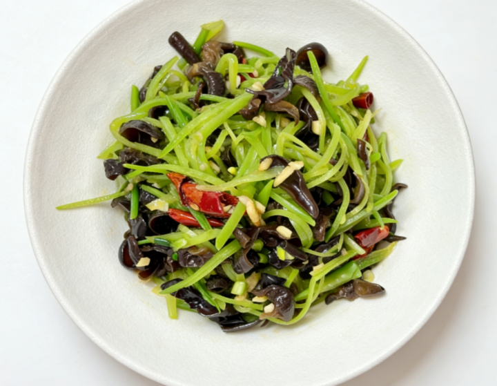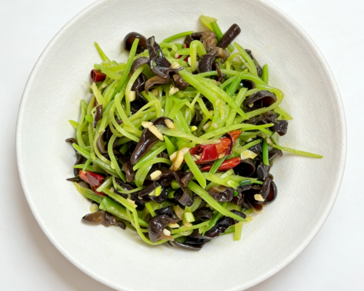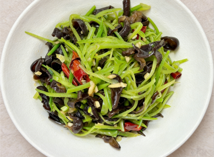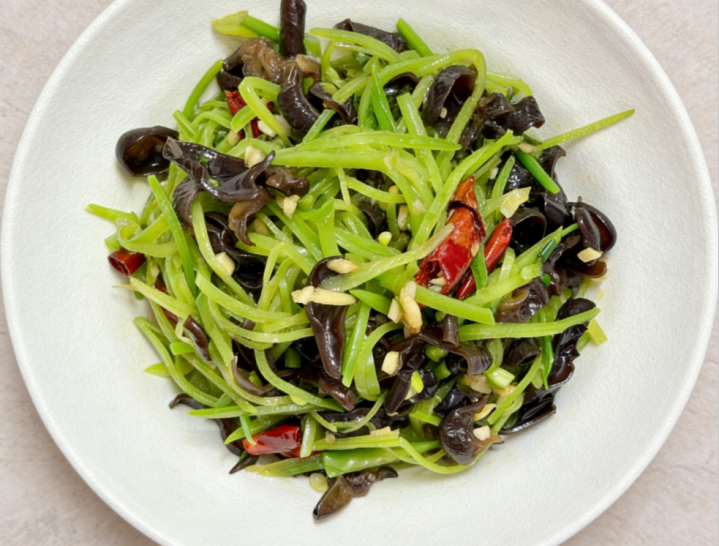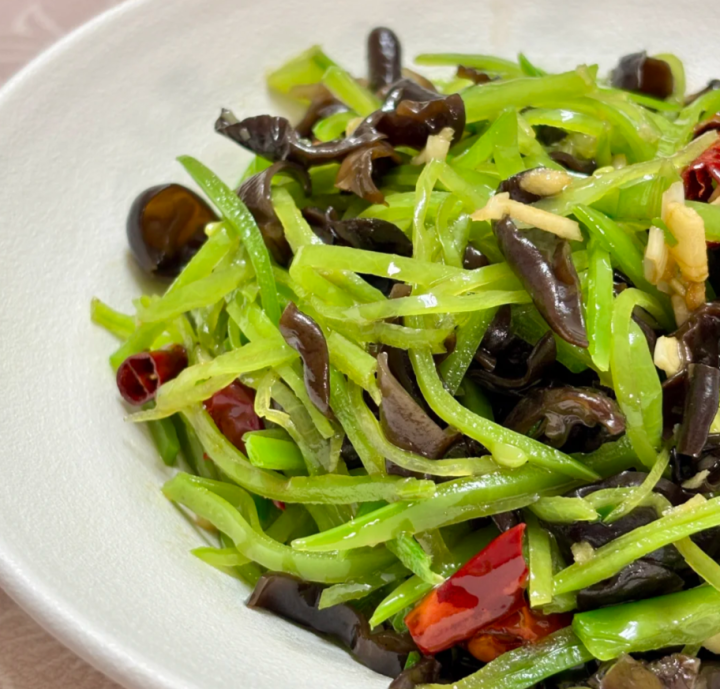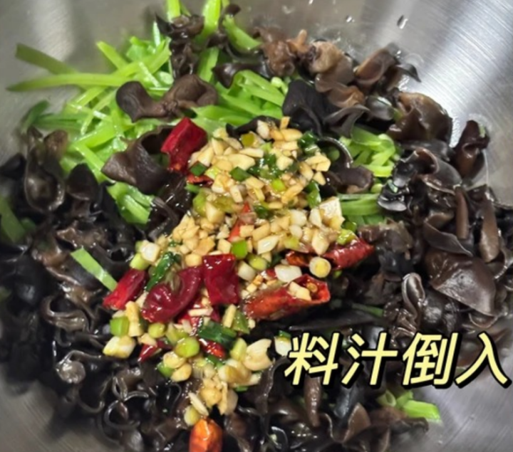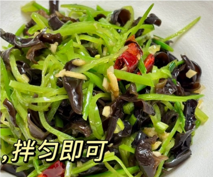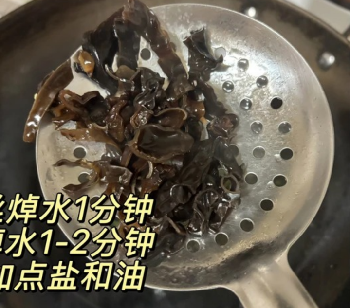 别用沸水泡木耳,容易毒!用温水(40度傍边)加一勺白糖,盖上盖子摇晃2分钟,静置10分钟就泡好了。洗净后切成细丝,越细越入味。