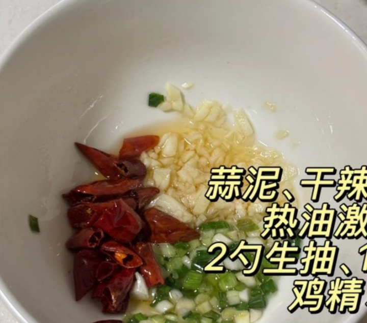第三步:引发出蒜香把蒜末、小米辣放在碗底。烧一点热油(或者泛泛炒菜的一半量),烧到微微冒烟,“滋啦”一声泼在蒜末上。这一下,蒜香味骤然被炸出来,比径直拌可口一百倍!