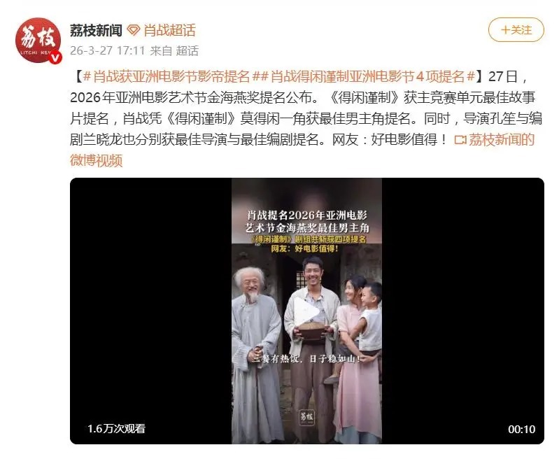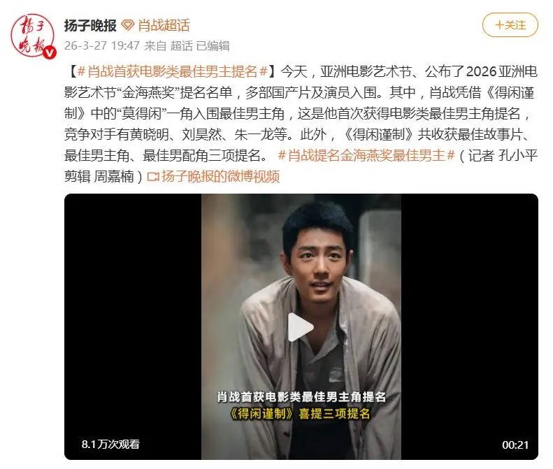 据3月27日报说念,2026年亚洲电影艺术节“金海燕奖”提名名单的公布,在相聚上投下了一枚惊喜炸弹。焦点中的焦点,是演员肖战——他凭借在电影《得闲谨制》中饰演的“没有闲”一角,初度取得电影类最好男主角提名,将与黄晓明、刘昊然、朱一龙等实力派同台竞技。