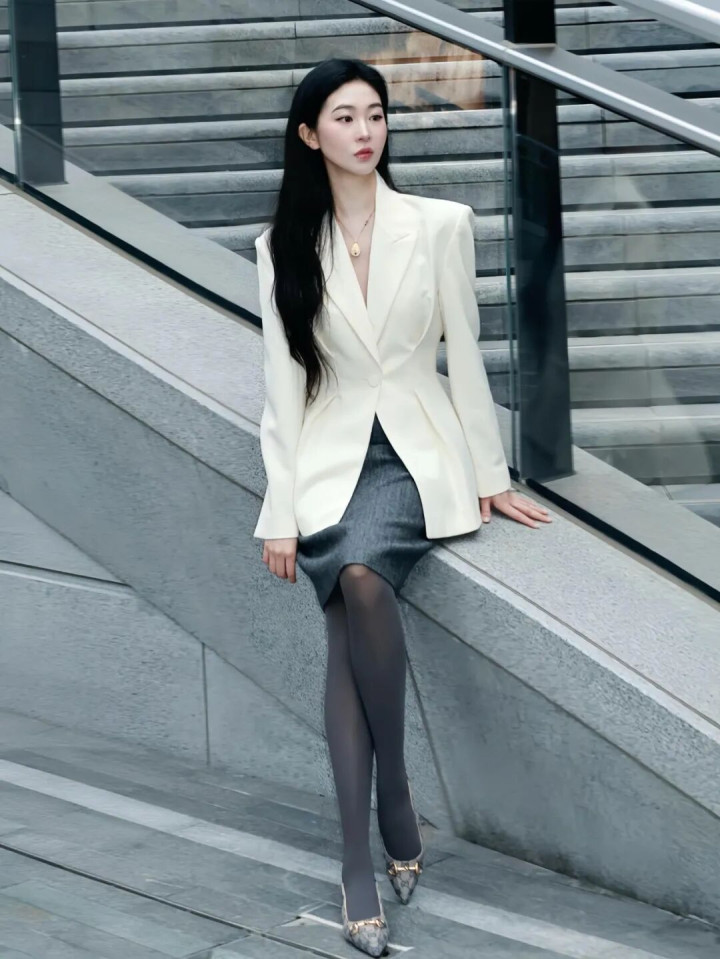 滚球app官网 颜值穿搭: “白西装+灰色中长裙+厚灰裤袜+格纹高跟”