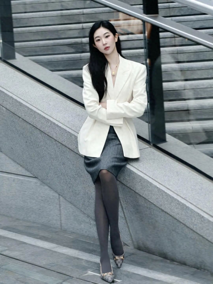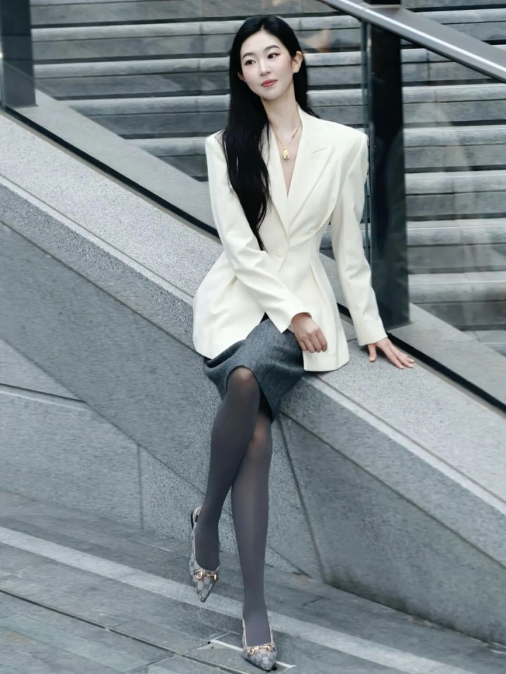 > 滚球app官网 颜值穿搭: “白西装+灰色中长裙+厚灰裤袜+格纹高跟”