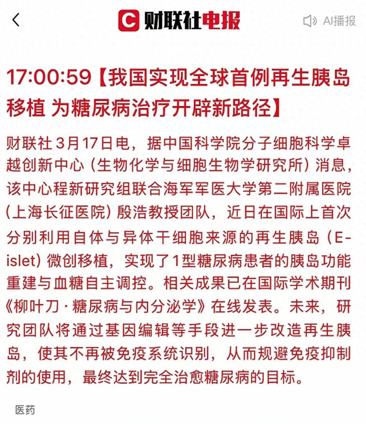2026年3月17日,中国科学院连合上海长征病院提神对外发布重磅科研恶果,团队完成大家首例自体与异体干细胞着手再生胰岛微创移植,收效匡助1型糖尿病患者重建胰岛功能、实现血糖自主调控,联系考虑恶果发表在海外顶级医学期刊《柳叶刀·糖尿病与内分泌学》。这一打破不仅改写糖尿病休养的大家气象,也为A股再生医学板块带来全新的产业机遇。