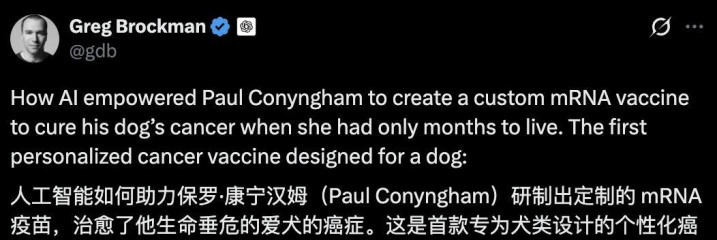 OpenAI总裁Greg Brockman默示这是首例专为犬类瞎想的个性化癌症疫苗。