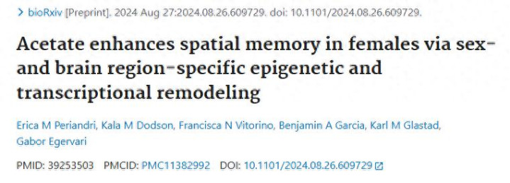 参考文件: Periandri EM靠谱的滚球app中国官网, Dodson KM, Vitorino FN, et al. Acetate enhances spatial memory in females via sex- and brain region-specific epigenetic and transcriptional remodeling. bioRxiv. 2024. doi:10.1101/2024.08.26.609729