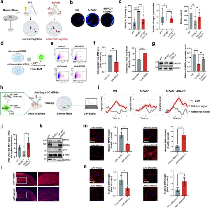 图二 ALKBH3缺失补救了5xFAD小鼠的空间挂念断绝和钙稳态失调
