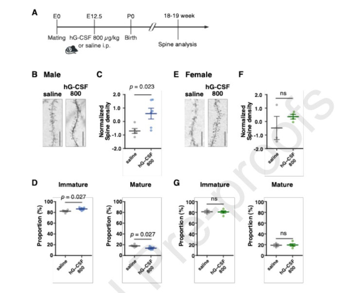母体败露于hG-CSF会更动雄性后代的树突棘花式,但对雌性后代无此影响