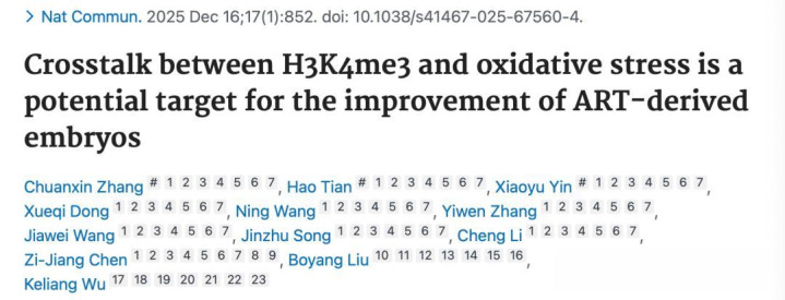 Crosstalk between H3K4me3 and oxidative stress is a potential target for the improvement of ART-derived embryos. Nat Commun. 2025 Dec 16;17(1):852. doi: 10.1038/s41467-025-67560-4.靠谱的滚球app中国官网