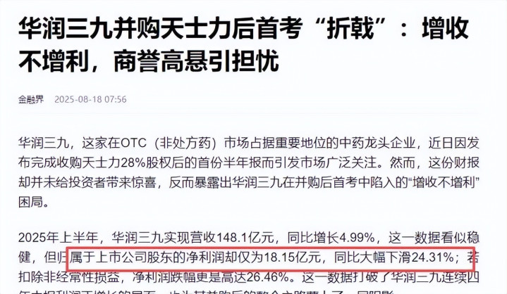 华润三九接办后,天士力2025年全年营收82.36亿元,同比降3.08%,归母净利润11.05亿元,同比增15.68%。扣非净利润7.87亿元却同比降24.06%,中枢原因是交易板块下滑。