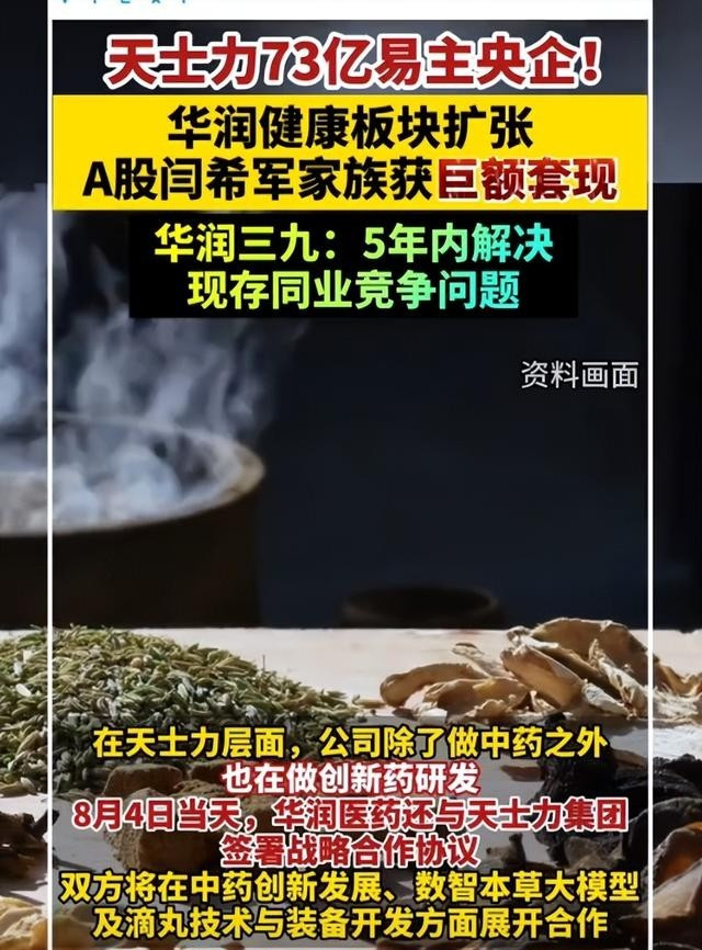 2024年8月4日天士力公告,控股鼓动天士力集团过火一致活动东说念主把28%股份以每股14.85元、总价62.12亿元转让给华润三九,另5%股份以11.09亿元给国新投资,总套现超73亿。