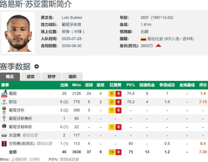 路易斯-苏亚雷斯算是足坛流浪汉,着力过多家俱乐部,球员于2025年夏窗以2295万欧元的转会费从阿尔梅里亚加盟葡萄牙体育,就此走上了球星之路。