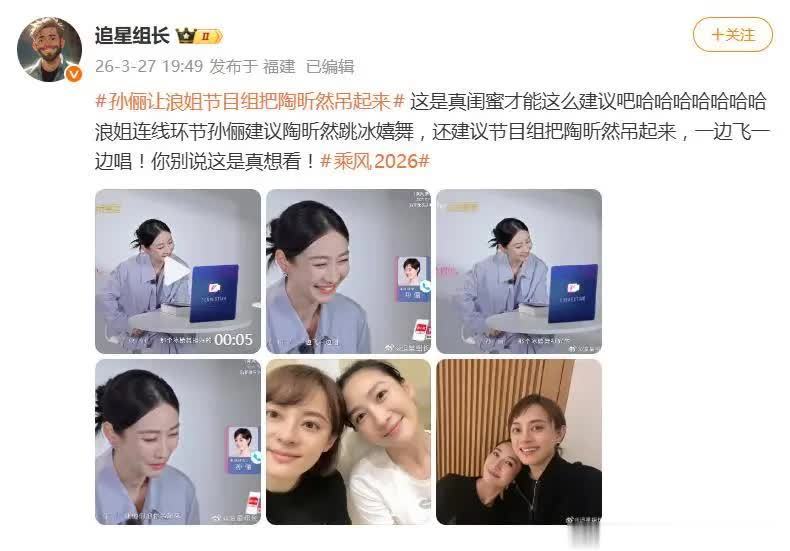 3月27日,有网友爆料称,《乘风2026》(浪姐第7季)的亲一又连线片断,让《甄嬛传》剧粉和综艺不雅众炸开了锅。孙俪给好姐妹陶昕然打气时,语出惊东说念主,建议节目组“把陶昕然吊起来,一边飞一边唱”,还提议重现剧中“冰嬉舞”名时局。网友笑评:“这是真闺蜜,才敢这样‘下狠手’!”