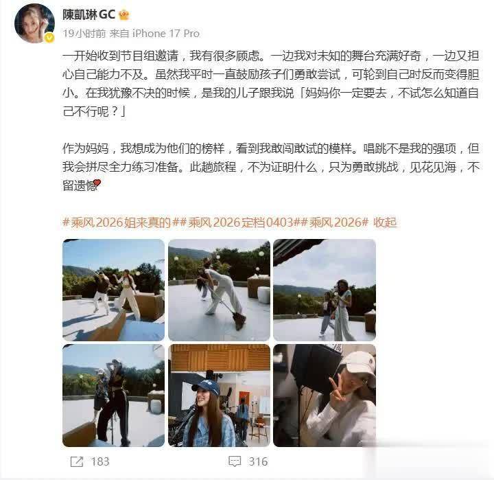 在官宣讯息里,陈凯琳并未大谈舞台梦念念,而是坦诚共享了我方的纠结与怯懦。她裸露,率先收到节目组邀请时,内心尽是矛盾:一方濒临未知的舞台满怀有趣,另一方面又深深忧虑我方智商不及。“虽说我普通里一直饱读吹孩子们勇敢尝试,可轮到我方时却变得病弱起来。”这种“育儿意思齐显豁,我方实施却退避”的真确气象,一刹激励了稠密姆妈网友的共识。