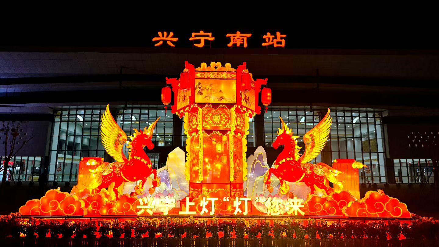 兴宁南站的花灯以“兴宁上灯‘灯’您来”为主题,主题灯笼正面宽约3.4m、高约4.4m,大气从简的经营与站区空间井水不犯河水,让交往游客刚抵达兴宁,便能感受到“中国花灯之乡”的特有文化氛围,为“上灯+”系列举止的引流增效筑牢了视觉基础。