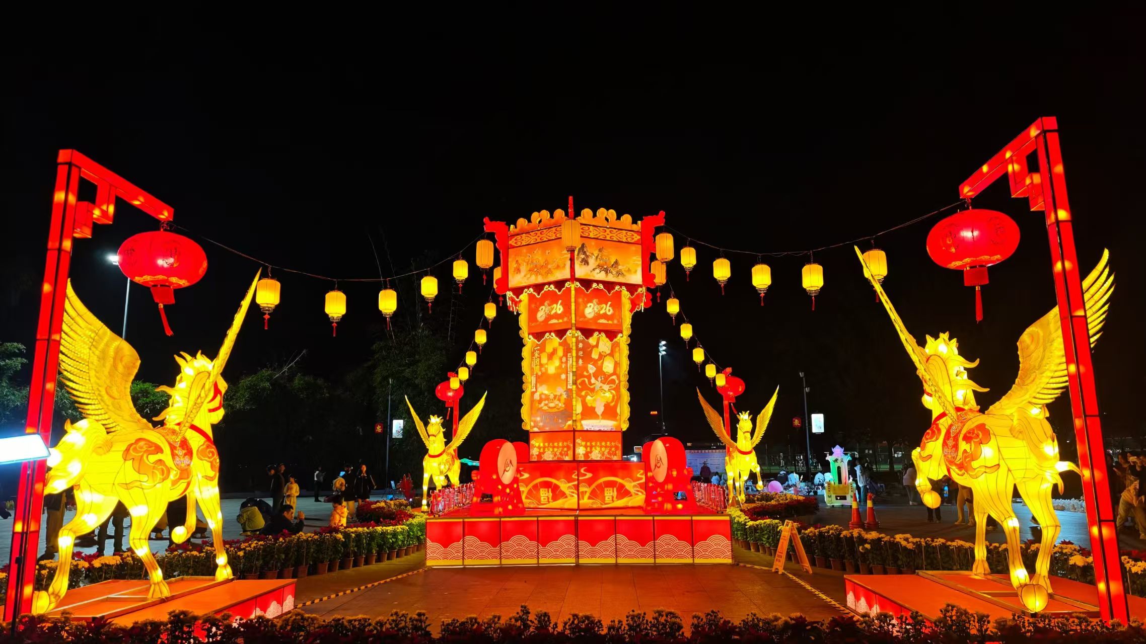 明珠体育广场行为城区中枢幽闲神色,花灯经营围绕“来兴宁上灯 添好运年年”主题张开,主题灯笼正面宽约4.5m、高约6m,四匹展翅的天马造型花灯环绕主灯而立,酿成拱卫呼应之势,将传统新春的灵动与祯祥氛围层层铺开,与广场边远清朗的幽闲场景井水不犯河水。