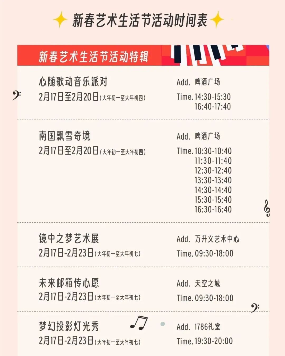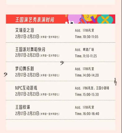 步履实质:小镇春节假期举办“新春艺术生涯节”步履,邀请摇滚和民谣乐队演唱。其中还有东谈主偶巡游、王国演艺秀、南国梦境飘雪、镜中之梦艺术展、过去邮箱传心愿、1786会堂灯光投影秀、汉服全家福拍摄等步履实质。