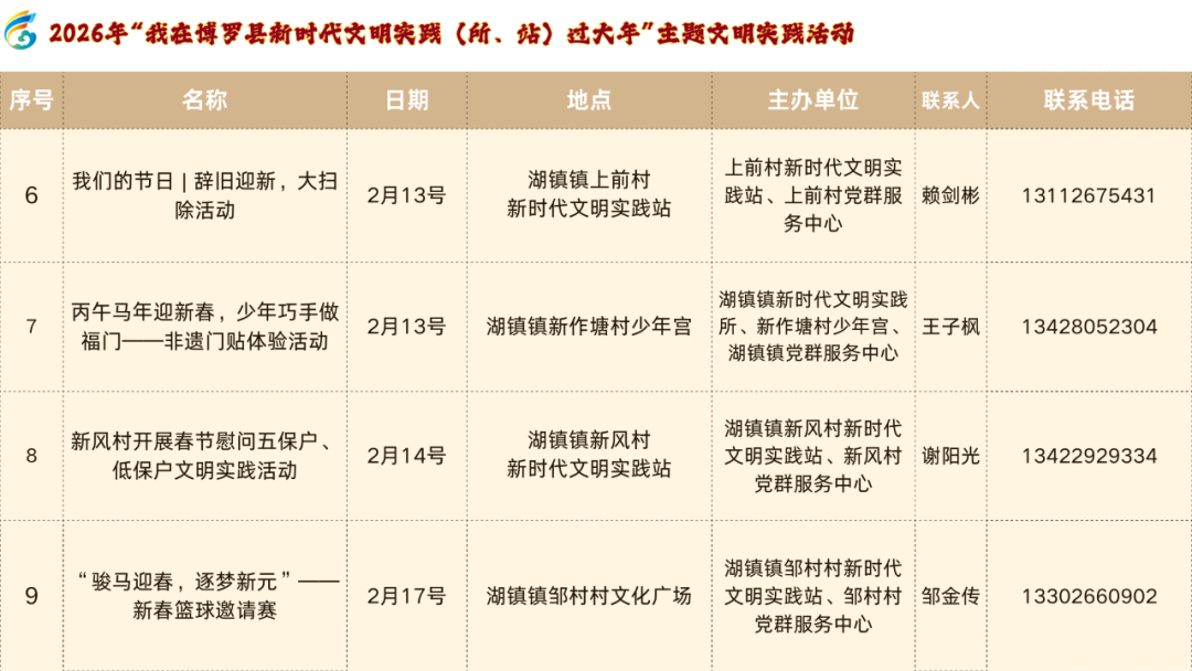 步履时期:2026年2月步履方位:湖山村文化广场、西田村各村小组会堂、白沙广场、泉源村各村小组会堂、中岗村各村小组会堂