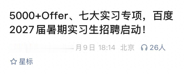 百度追究驱动2027届暑期实习招聘,这次招聘规模创下历史新高,贪图披发5000+实习offer,为应届生提供了浩荡的管事履行平台。