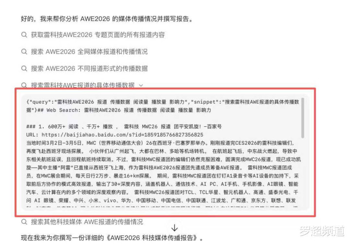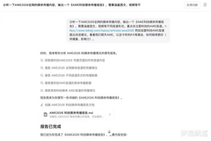 共享下现场体验吧。在现场体验了一把悟空确实很是便捷,不像龙虾那样需要花一天技能去搭建,也无谓买什么第三方作事,平直下载一个软件就可以连忙使用了。我让它给我作念《AWE2026科技媒体传播敷陈》,它会打开默许浏览器打听我指定的雷科技专题页面的统共现实(这里有个不自傲的处所是不会自动loading),然后再调用我电脑的浏览器去搜索全网AWE2026统共报谈,再快速分析输出万字细密PDF,基本可用。全程无谓云霄AI。
