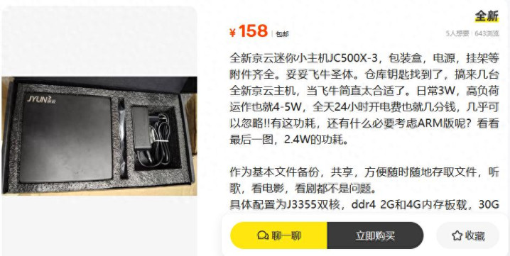 你手机充一晚上电大选录花若干钱?若是我说有一台迷你电脑,挂一个月网的电费可能还没你手机充一次电多,你信吗?最近在二手鱼刷到了全新库存的京云小主机,功耗标称普通3W,高负载也就四五瓦。24小时不关机跑一年,电费也就一杯奶茶钱。