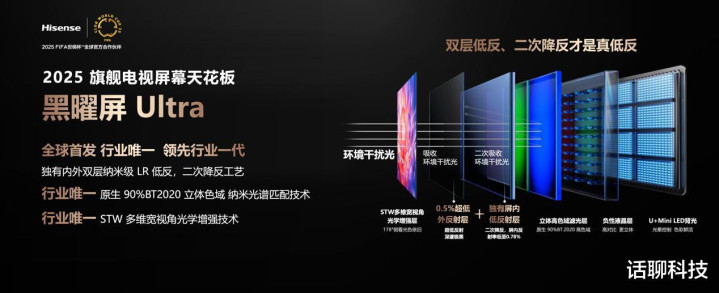 从咫尺了解到的海信电视居品搭载的屏幕分类来说,皆是接纳了超低反光盘算,咫尺最顶级的是黑曜屏Ultra,行业内唯独搭载表里双层纳米级低反膜,不错用终了1.28%超低反光率。