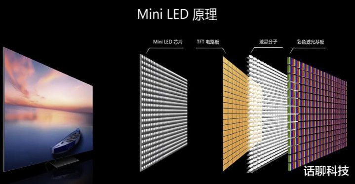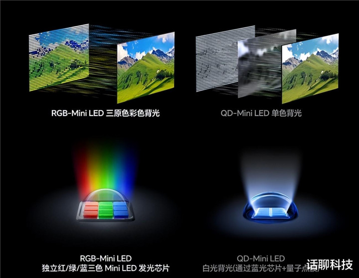 而RGB-Mini LED本色上依旧是LCD无机材料显现技能的发展,但不同于传统LCD的大尺寸背光模组,其结构结构上把直径100-300微米的分区可控亮度的MiniLED灯珠阵列,代替传统的LCD的背光光源,从而赢得忘形OLED的玄色真黑和超高对比度上风,并弥补了OLED屏幕有机发光材料寿命短、容易烧屏、亮度不够高的舛错。